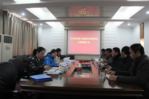 2月13日下午,市文明辦檢查組第三小組在領(lǐng)隊(duì)、市文明辦辦公室主任王曉群帶領(lǐng)下,對我院申報(bào)創(chuàng)建第十一屆市文明單位進(jìn)行檢查驗(yàn)收。檢查組首先聽取了賀玉龍?jiān)洪L代表我院所作的創(chuàng)建工作匯報(bào),隨后按照《第十一屆滁州市文明單位測評細(xì)則》對我院申報(bào)創(chuàng)建材料進(jìn)行了認(rèn)真的查驗(yàn),并對我院辦公及周圍環(huán)境進(jìn)行了實(shí)地查看。副院長丁文軍、王士才、黃明華、袁家金和院文明創(chuàng)建領(lǐng)導(dǎo)小組辦公室主任季阿祥參加了匯報(bào)會。