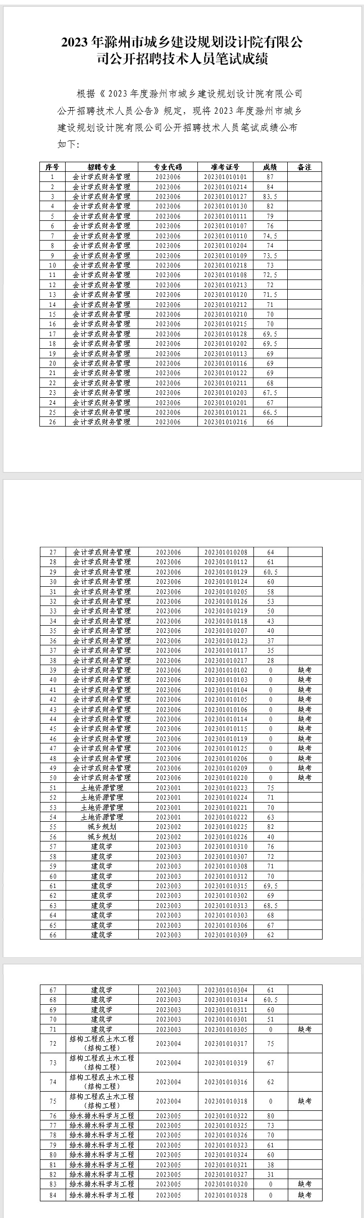 2023年滁州市城鄉(xiāng)建設規(guī)劃設計院有限公司公開招聘技術人員筆試成績