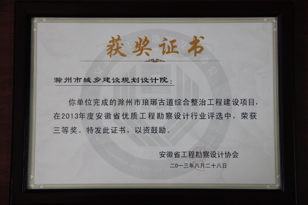 安徽省工程勘察設(shè)計協(xié)會于2013年8月3日組織專家召開安徽省優(yōu)秀工程勘察設(shè)計行業(yè)獎評審會,對全省共62家單位上報的320個項目進(jìn)行了為期兩天的評選。由我院市完成的滁州市瑯琊古道綜合整治工程建設(shè)項目在2013年度安徽省優(yōu)秀勘察設(shè)計行業(yè)評選中,榮獲三等獎。
